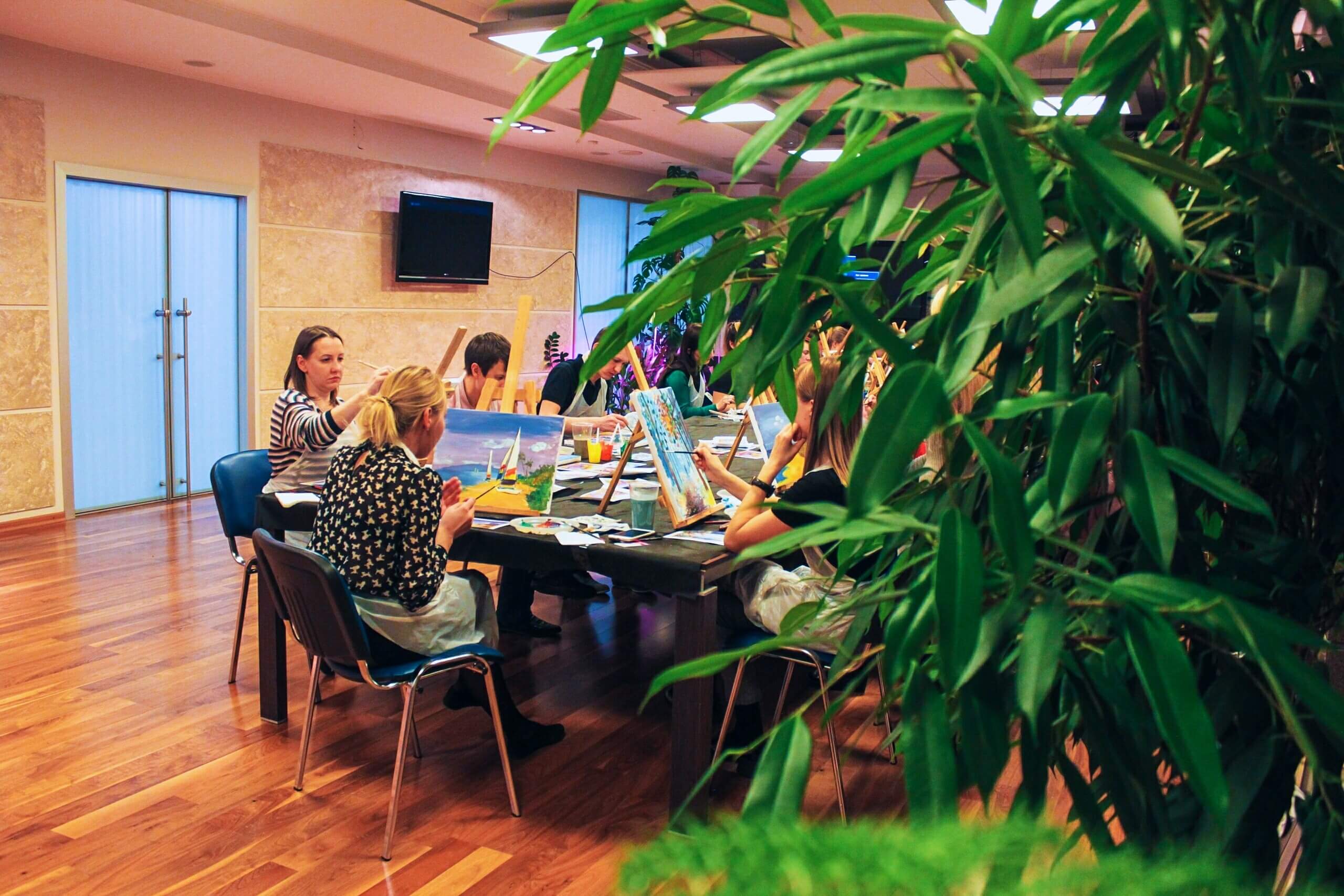 Однажды посреди недели, мы решили разбавить рабочие будни яркими красками – собрались в нашем просторном конференц-зале, пригласили мастеров из творческой студии рисования и на пару часов превратились в художников. Мастер-класс для нас проводили сразу несколько специалистов, таким образом, каждый сотрудник получил нужное ему количество внимания и подсказок от наставников.
